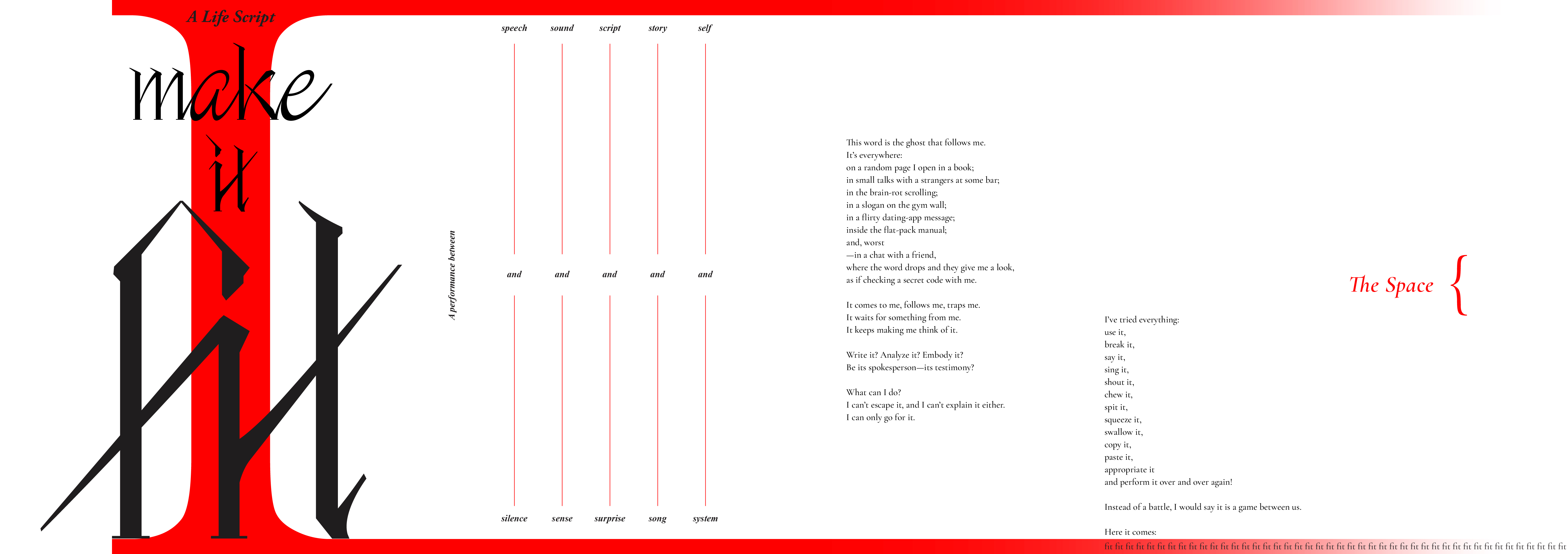 The audience is scripted to build, read and sing together—as an imaginary one—to examine how language performs us, and how we perform through language, by anatomizing the internalized life script of Make it fit.
