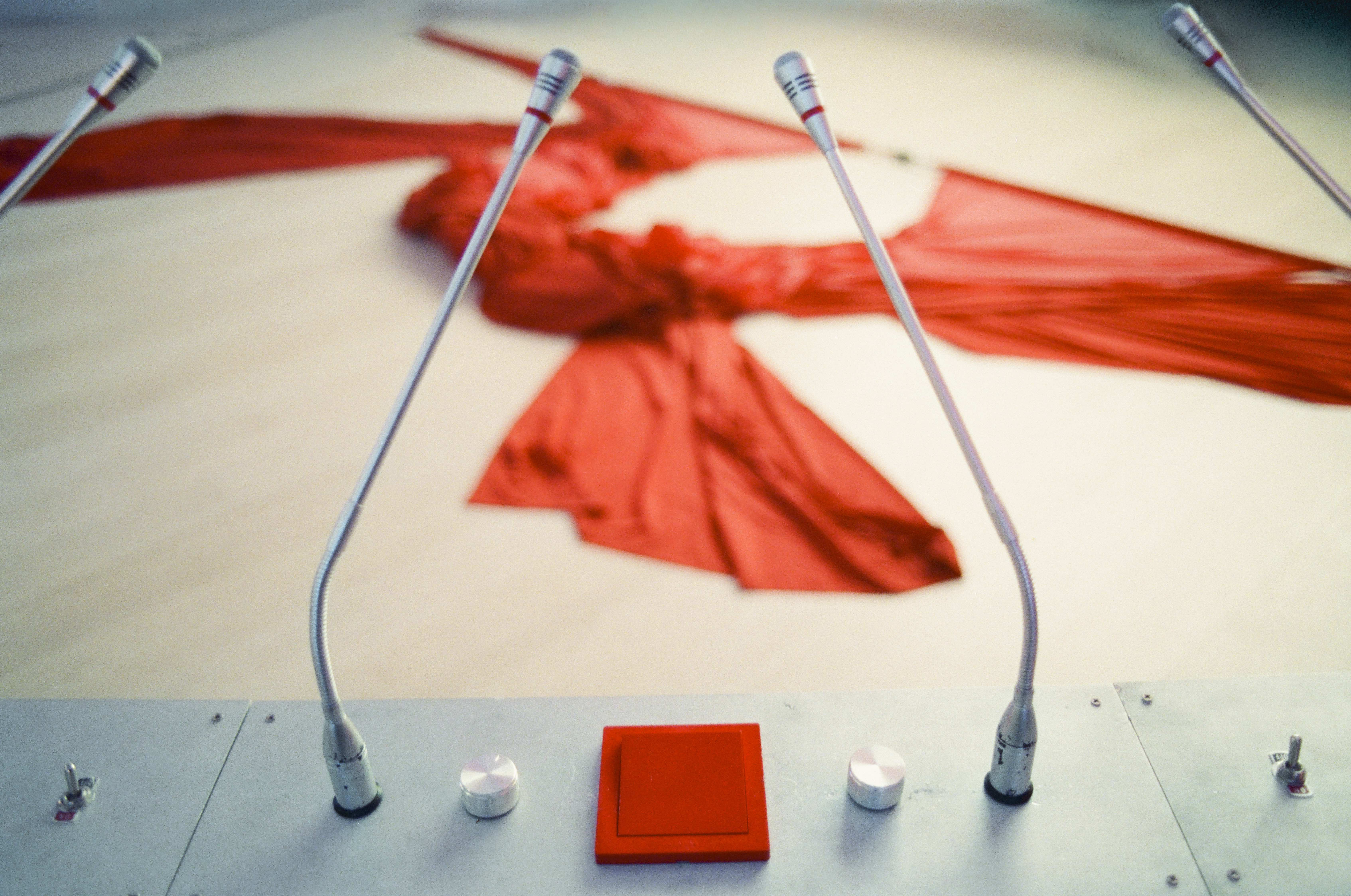 This parody of authoritarian speech is repeated over and over until a personal vulnerability seeps through the mask of satire: How to fit in a way that escapes fitting in? How to carve space for the security and comfort that fitting in brings?