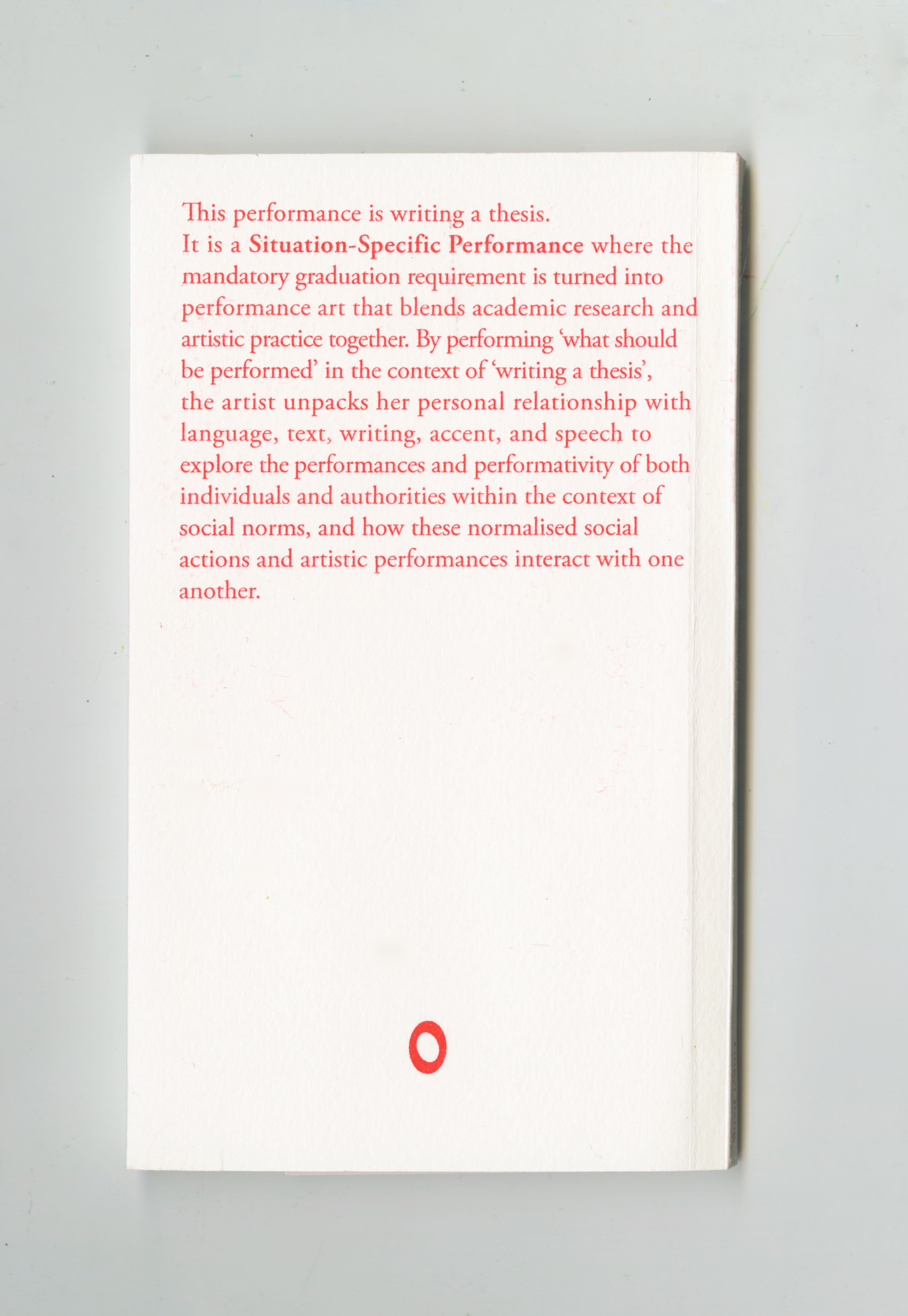 This performance is writing a thesis. It is a Situation-Specific Performance where the mandatory graduation requirement is turned into performance art that blends academic research and artistic practice together. By performing ‘what should be performed’ in the context of ‘writing a thesis’, the artist unpacks her personal relationship with language, text, writing, accent, and speech to explore the performances and performativity of both individuals and authorities within the context of social norms, and how these normalised social actions and artistic performances interact with one another.